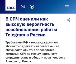 ⚡️ «Есть высокая вероятность», что Telegram выполнит требования российских властей и его работа в России будет восстановлена, сказал ТАСС член президентского совета по правам человека (СПЧ) Александр Ионов.