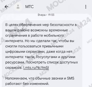 Москвичи стали получать смс-сообщения об ограничении мобильного интернета в целях обеспечения мер безопасности.