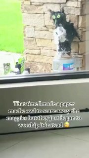 Мужчина сделал из папье-маше чучело совы, чтобы отпугивать от своего дома сорок. Отделаться от надоедливых птиц не вышло, зато среди пернатых случайно был создан новый культ.