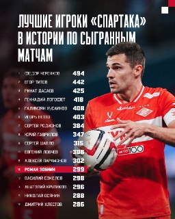 Роман Зобнин вышел на чистое 12-е место среди всех игроков «Cпартака» по сыгранным матчам за клуб.