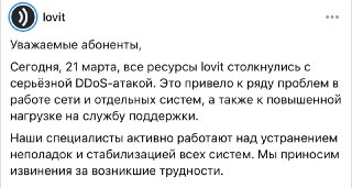 Проблемы возникли после DDoS-атаки. Компания Lovit обещала восстановить связь к утру, но интернета до сих пор нет. Местные недовольны тем, что провайдер «захватил» их дома, и готовят жалобу в ФАС касательно монополии компании.