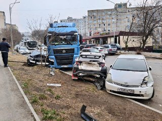Пьяный водитель фуры протаранил несколько машин во Владивостоке. Неадекват и его друг забаррикадировались в кабине, пока разгневанные владельцы разбитых иномарок слали им проклятья. Видео с задержанием есть в канале «Восток-Медиа».