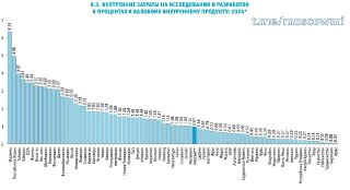 Внутренние затраты на исследования и разработки в России составили всего 0,97% ВВП, следует из ежегодных данных. Это почти в 6 раз меньше, чем у Израиля, Южной Кореи, Тайваня, США, Японии и других стран. Также госрасходы на гражданскую науку составили всего 0,36% ВВП, что стало минимумом за 10 лет, указано в отчёте ВШЭ.