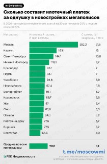 На втором месте — Казань с платежом около 163 тысяч рублей в месяц, на третьем — Питер с платежом 144 тысячи рублей месяц.