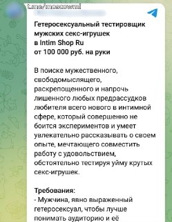 🔞 Тестировать мужские секс-игрушки предлагают в Москве за 100 тысяч рублей.