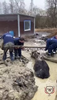 Спасатели обвязали корову веревками, все перепачкались, но все же вытащили бедолагу на твердую поверхность.
