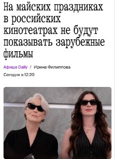 В российских кинотеатрах полностью откажутся от иностранных фильмов с 1 по 10 мая — все майские только отечественное кино. Под раздачу попали сразу две громкие премьеры: байопик «Майкл» про Джексона и продолжение «Дьявол носит Prada». Оба фильма выйдут в мае, но россияне увидят их позже — или нет вовсе.