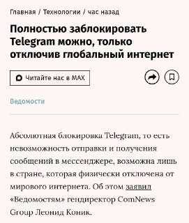 Так считает гендиректор ComNews Group Леонид Коник. Отключение от мессенджера возможно только если страна будет физически отключена от мирового интернета. Это подтвердил и Дмитрий Петров, гендиректор провайдера «Комфортел».